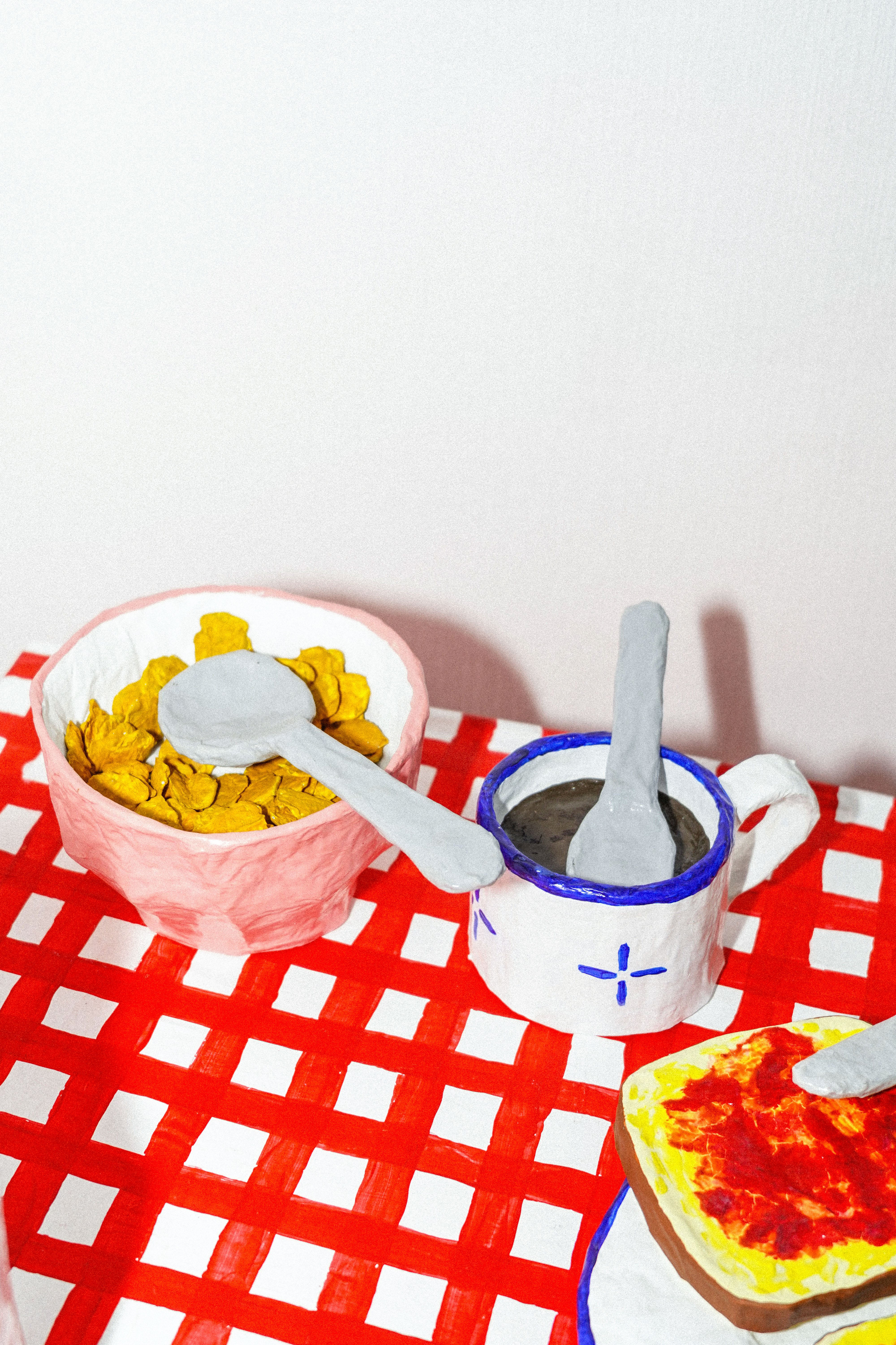 An installation and performance exploring the poetry of everyday life. Papier-mâché objects and staged gestures transform ordinary moments into intimate, playful scenes.