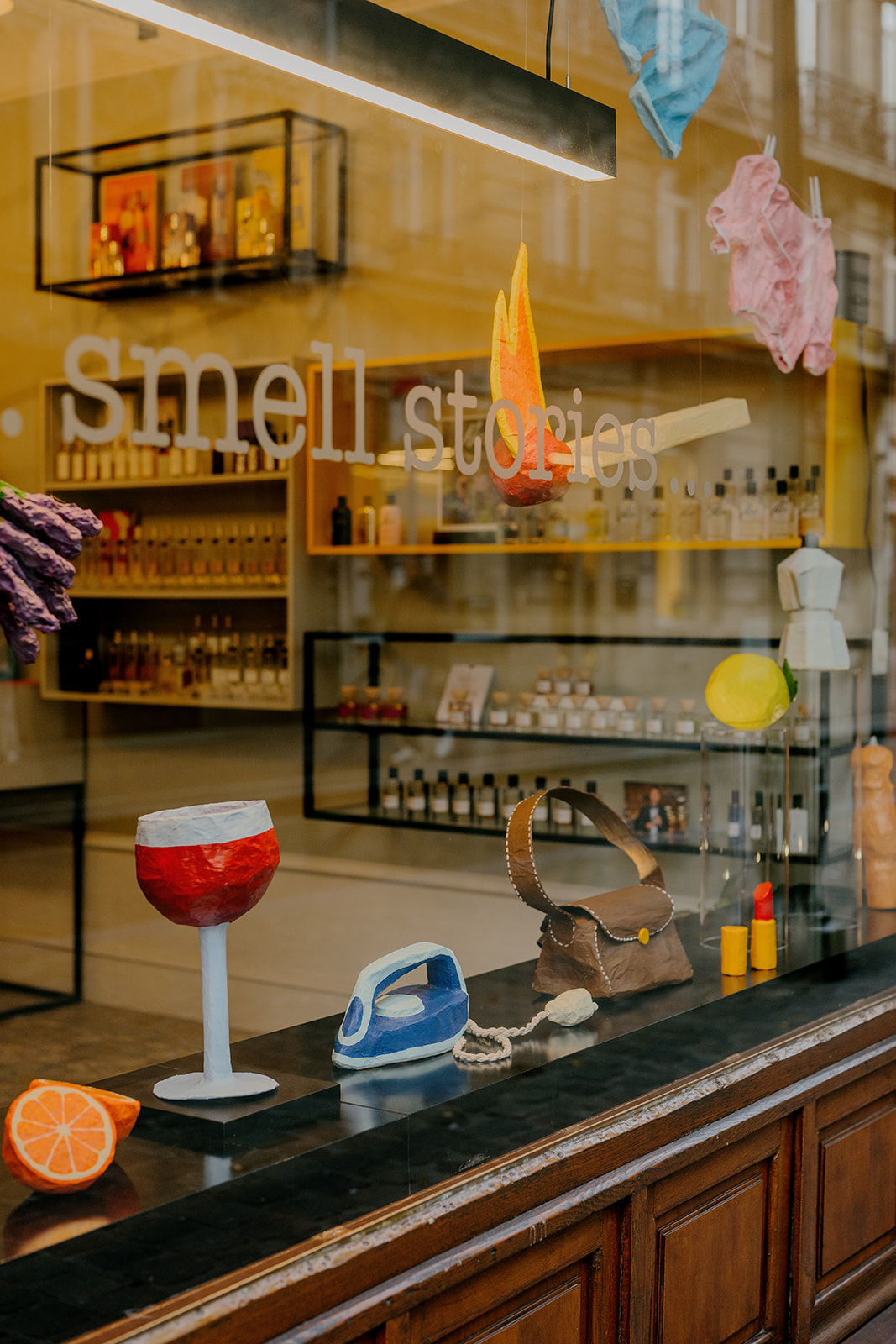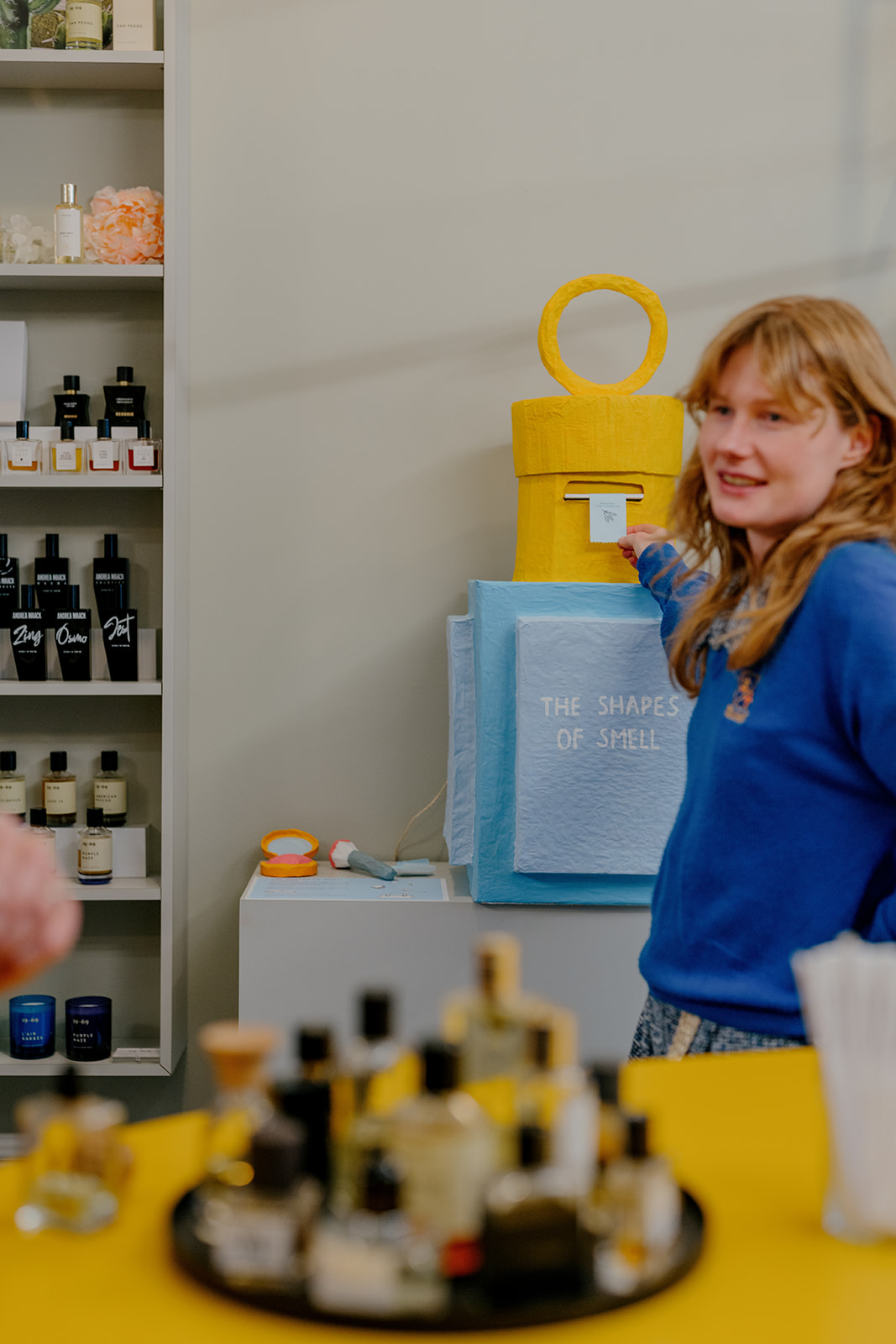 This window installation at Smell Stories transforms fragrances into sculptural forms. Through the Smell Generator, visitors discover a scent’s drawn shape, spray the matching perfume, and take home a small scented memory.